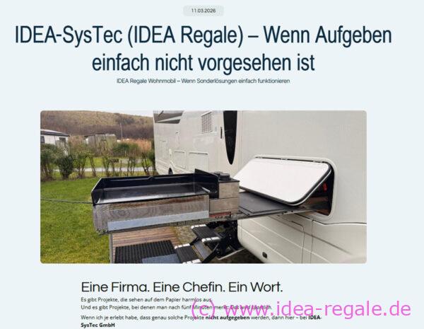 Wohnmobil Regale vom Profi. Einbauservice ihres Regalsystem in der Nähe von Stuttgart. Fachgerecht vom Caravan-Techniker und nach Ihrem Wunsch. Sehr viele unterschiedliche Systeme im Sortiment. Regale für Wohnmobil, Camper und Kastenwagen. Wir von IDEA-SysTec – dem Original – bieten maßgefertigte Lösungen. Für mehr Platz und Ordnung, kein stapeln und räumen mehr. Regalsystem mit Auszug. Transportlösungen für Fahrräder. Mit unseren langjährigen Erfahrungen von 21 Jahren, professioneller Beratung und Made in Germany sind Sie bei uns genau richtig.