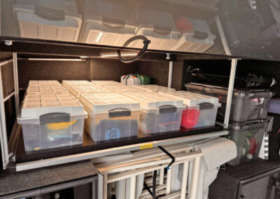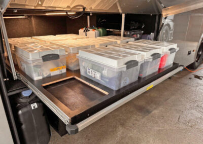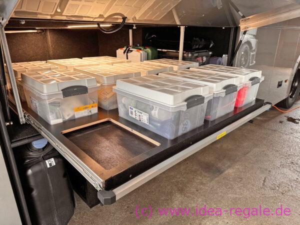 Vorne im Auszug steht eine große Kühlbox. Der Teleskopauszug hat eine Tiefe von 180 cm und 170 kg Lastwert.