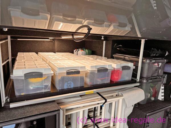 Oben im Gestell eine Siebdruckplatteneinlage für verschiedene lange Gegenstände. Seitlich mit Alublech gegen ein herausfallen gesichert.