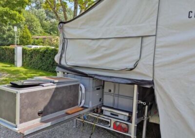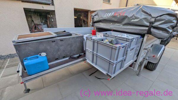 Campwerk Family Zeltanhänger Bodenauszug 185 cm mit Brett auf 190 cm Verlängert. 160 kg Traglast Lock in Lock out Verriegelung