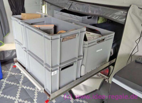 Unter dem Auszug wurde noch ein Fixierungsrahmen eingeklebt, wo flache Boxen nach Hinten durchgeschoben werden. Dadurch ist auch die untere Ebene sinnvoll für Kabel usw. genutzt. Die hinterste Box wird mit einer langen Schnur nach vorne gezogen und alle davor stehen Boxen auch. Simpel aber wirksam.