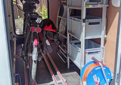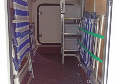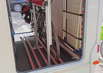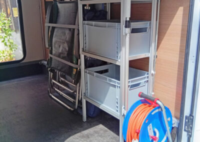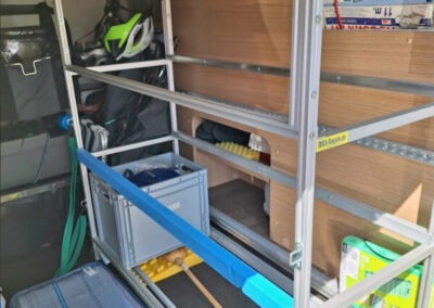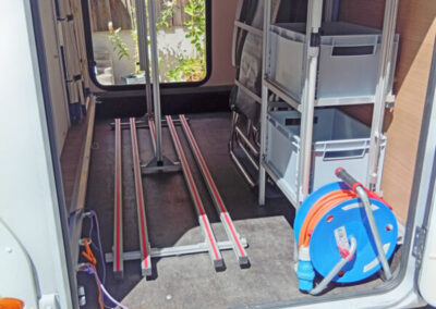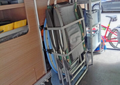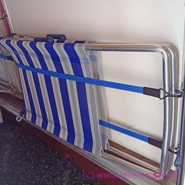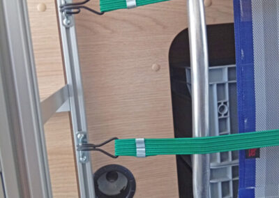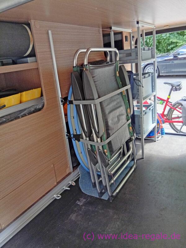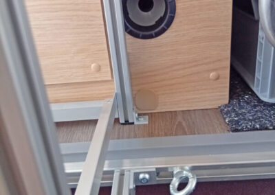 Da die Decke nicht stabil ist, wurde das Gestell an der Wohnwandseite Zurrschiene und Wand befestigt. Mit unseren schmalen Airlineschienen und Riemenkrampen kann man zusätzlich Tisch und Stühle befestigen.