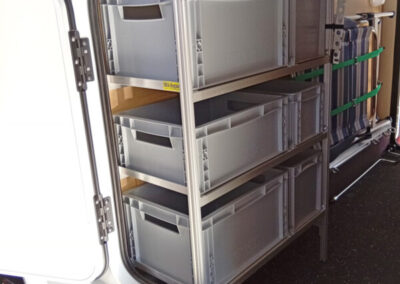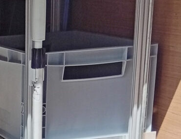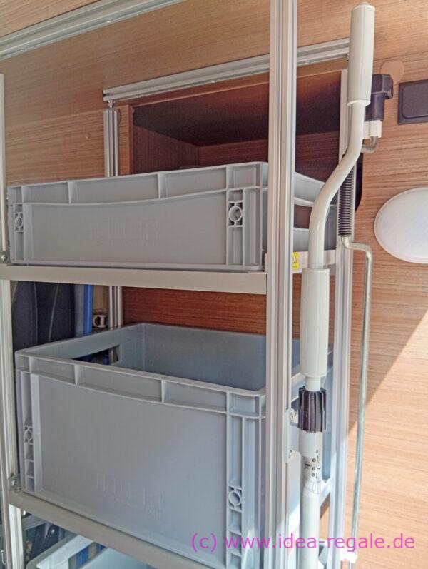um Gewicht zu sparen wurde auf einen Teleskopauszug verzichtet und die Boxen werden per Hand in das Gestell eingeschoben.