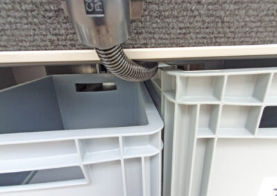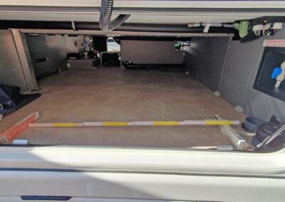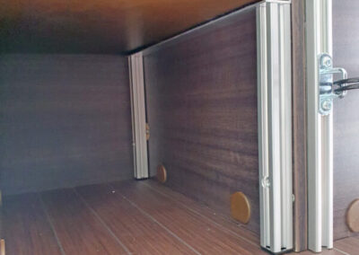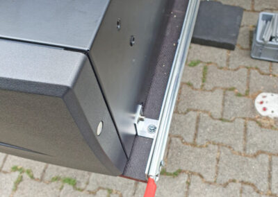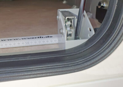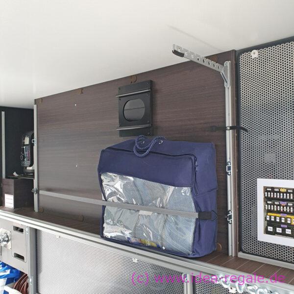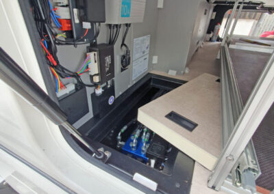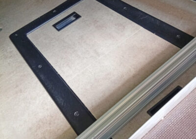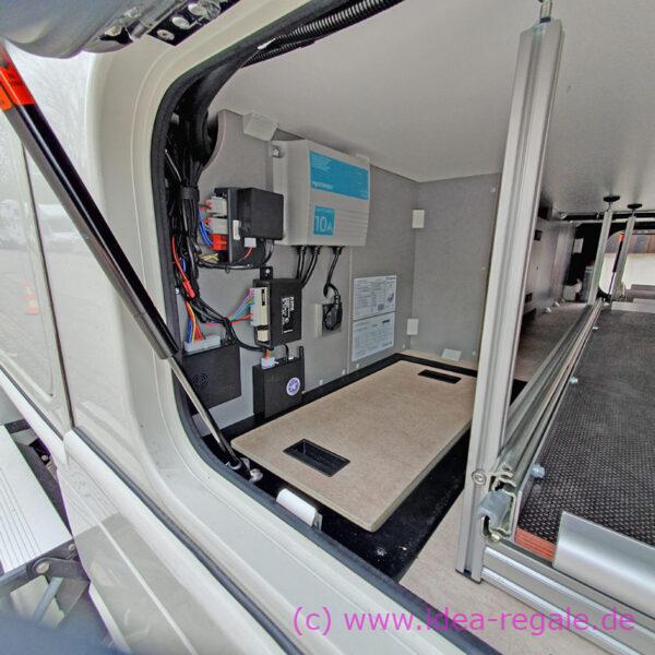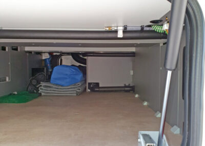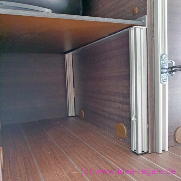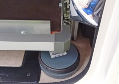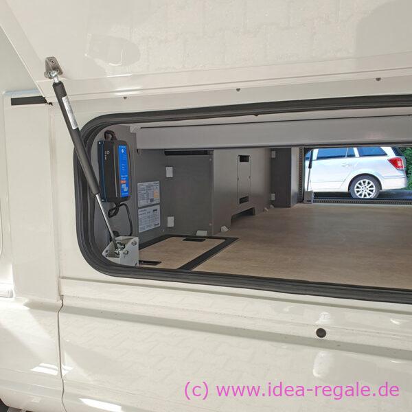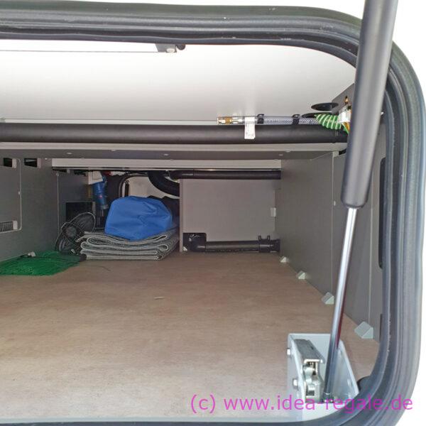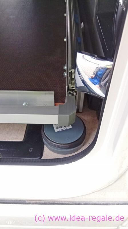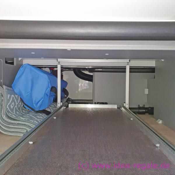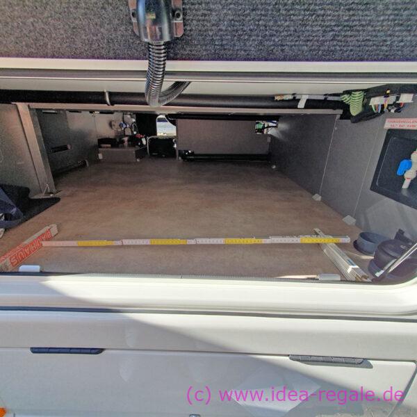 Da sich im hinteren Klappenfach sehr viele Hindernisse unter der Decke befinden, haben wir den Unterflurauszug mit vier aufgesetzten Stützen gefertigt. So hat man keine Problem die Stützen an geeigneter Position zu befestigen. Daher sind auch Fotos von der Decke für uns sehr wichtig.