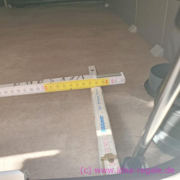 Ausmessen: legen Sie zwei Zollstöcke in die Flucht, wo man einen Auszug stellen kann. Beachten Sie dazu auch den Dämpfer. Hier sind es 80,5 cm an Platz vorhanden. Wie haben einen Unterflurauszug mit einer Stellbreite von 79,5 cm eingebaut mit der Einlage einer Siebdruckplatte 150 cm x 71 cm. Von der Klappe vorne muß man 11 cm Abstand halten, damit die Schloßfalle noch zu geht.