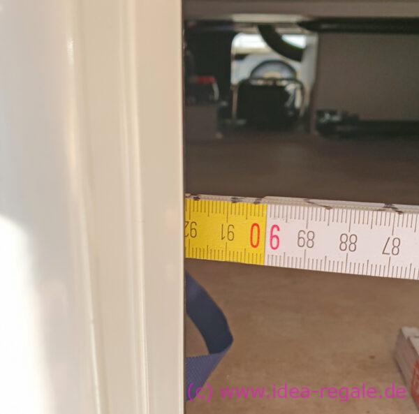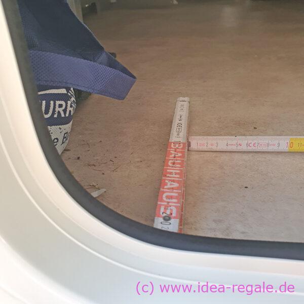 Am besten zwei Zollstöcke oder Latten längs in den Bereich einlegen, wo man einen Unterflurauszug nutzen kann. Bitte dabei auch Hindernisse wie Dämpfer, Rundungen der Klappenöffnungen, Kabelschächte am Boden oder dahinterliegende Shotwände mit berücksichtigen. Die Klappe ist oft Breiter wie der nutzbare Raum dahinter.