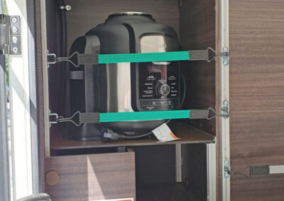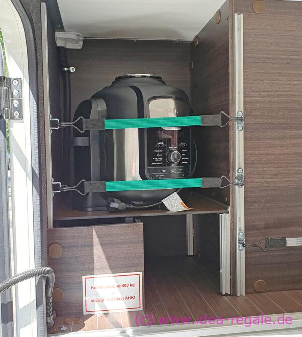 Gestell für einen Airfryer in der Nische mit unseren Wand-Profil-Schienen und Expanderbänder gesichert.