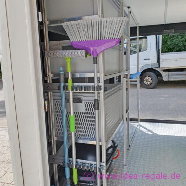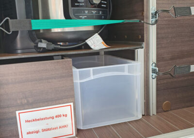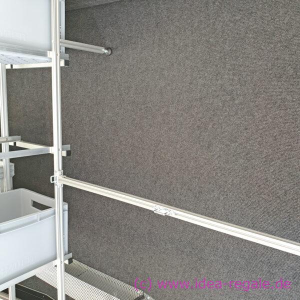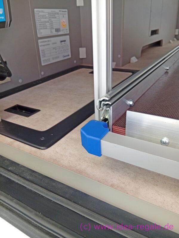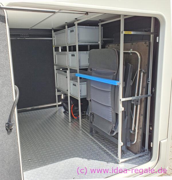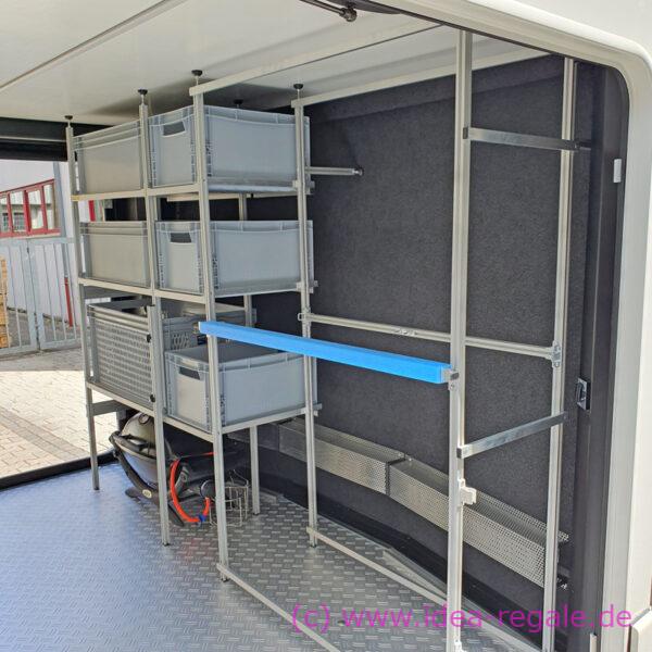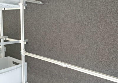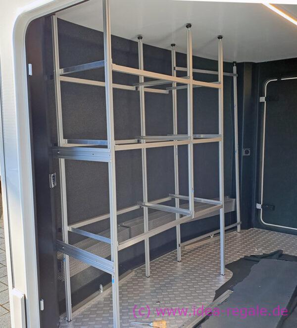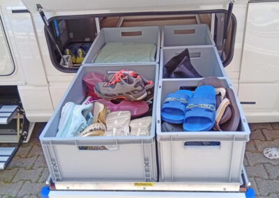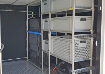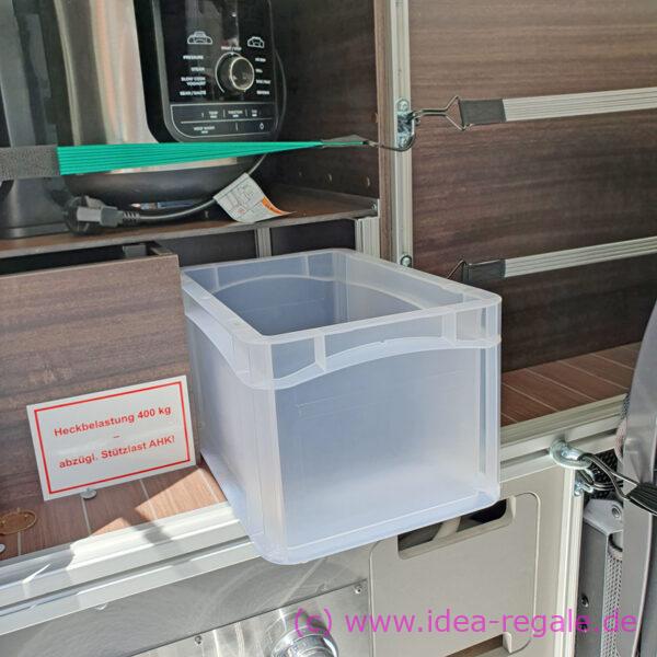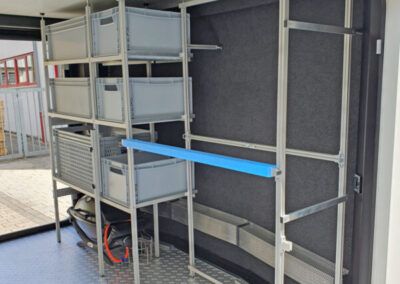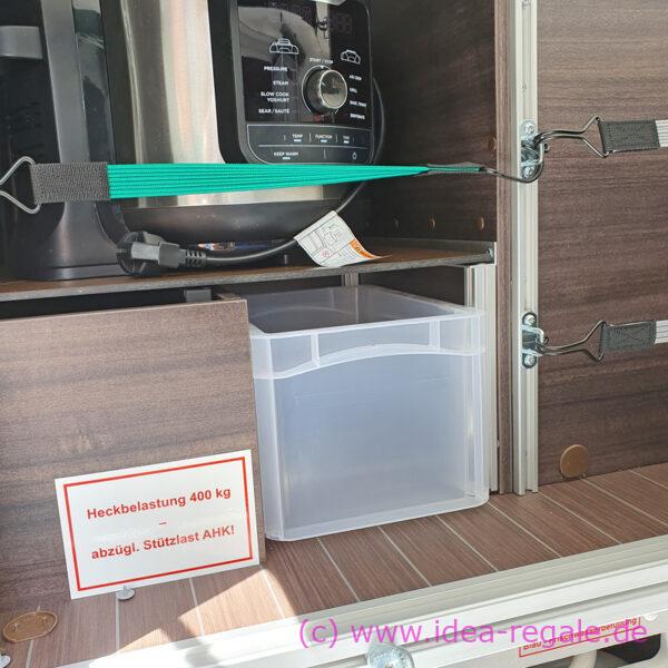 Das Gestell für die Boxen mit dem Camp-Anbau wurde zusätzlich an der Zurrschiene am Boden gesichert und hat zusätzliche Abstandshalter zur gerundeten Rückwand erhalten. So steht es fest und sicher.