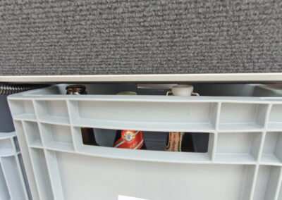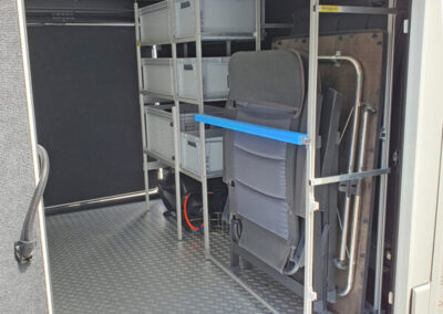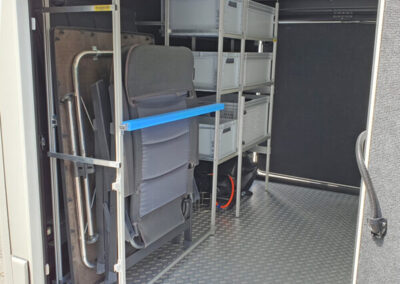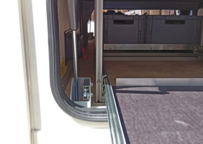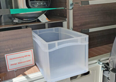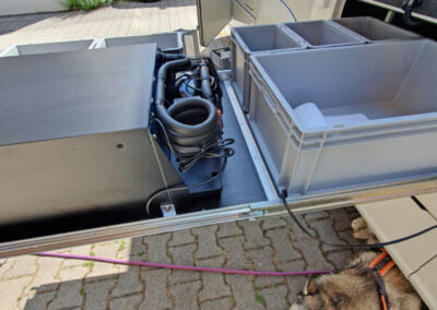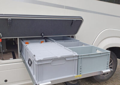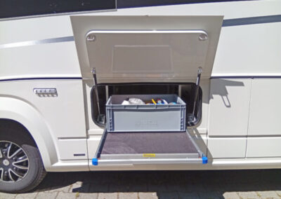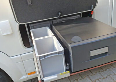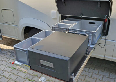 Hier wurde auf der Beifahrerseite hinten ein langer 150 cm Auszug mit 250 kg Traglast eingebaut. Auf die Siebdruckplatte wurde zusätzlich eine Kühlbox montiert.