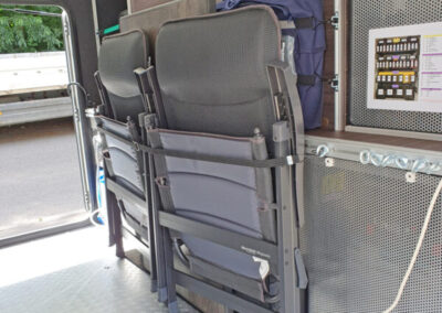 Die Stühle werden mit breiten Expanderbändern gesichert