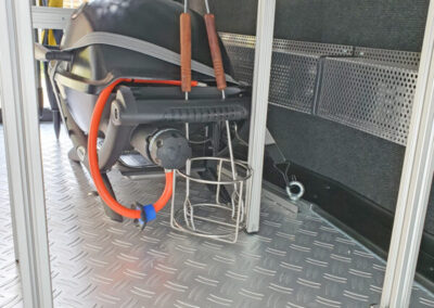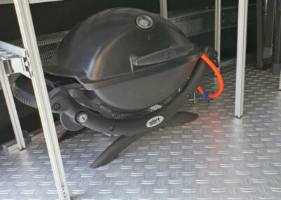 Auch der Weber-Grill wird mit Expanderbändern an der Zurrschiene am Boden fixiert.
