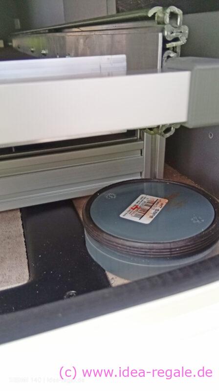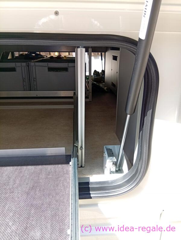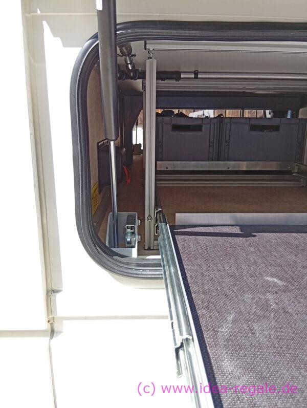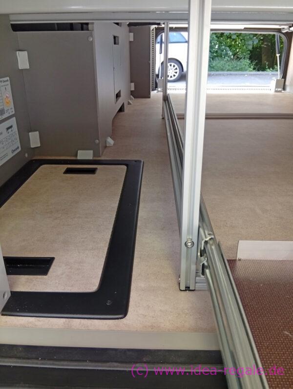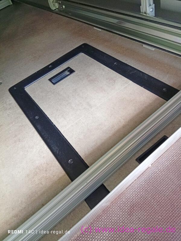 Hier passt dann ein Auszug mit einer Siebdruckplatte 140 cm x 61 cm und Stellbreite 69 cm. Eine Stütze steht auf dem rechten schwarzen Rand der Bodenluke.