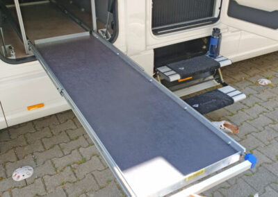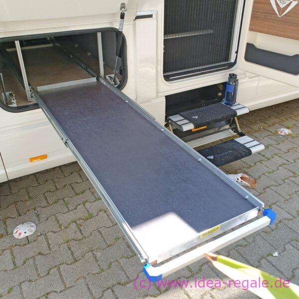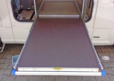Der Kunde hatte ein verstellbares Teil in seiner Heckgarage um den Roller in die Ecke zu fahren. Die mobile Motorradbühne ist mit vier Rollen mit Bremsen ausgestattet und wird an der Zurrschiene mit Spannbändern fixiert. Diesen Tip wollten wir gerne an Sie weiter geben.