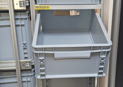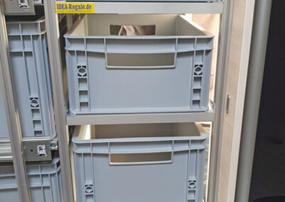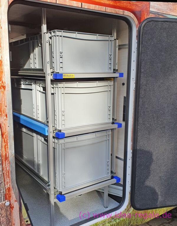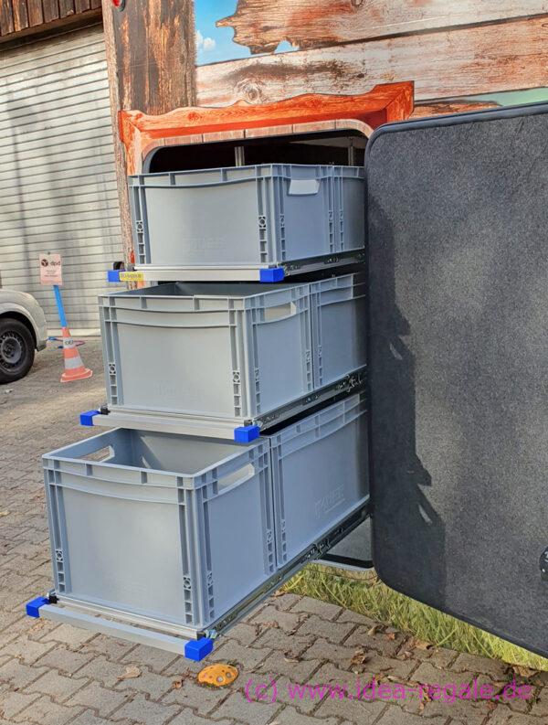 Trio-Auszug 80 cm zur Türe hin und dahinter ein Gestell für Boxen ohne Teleskopschienen