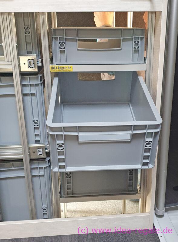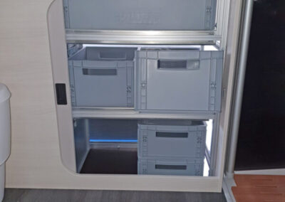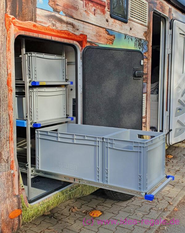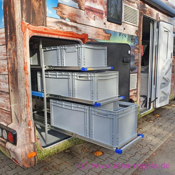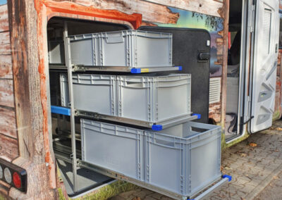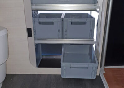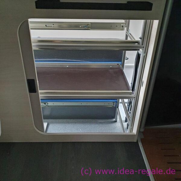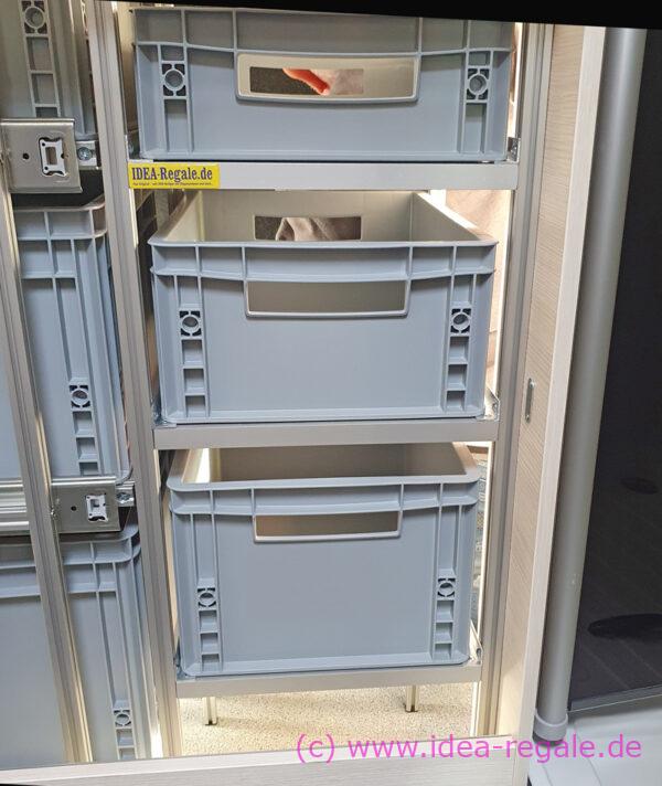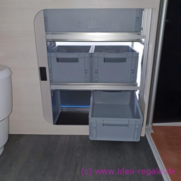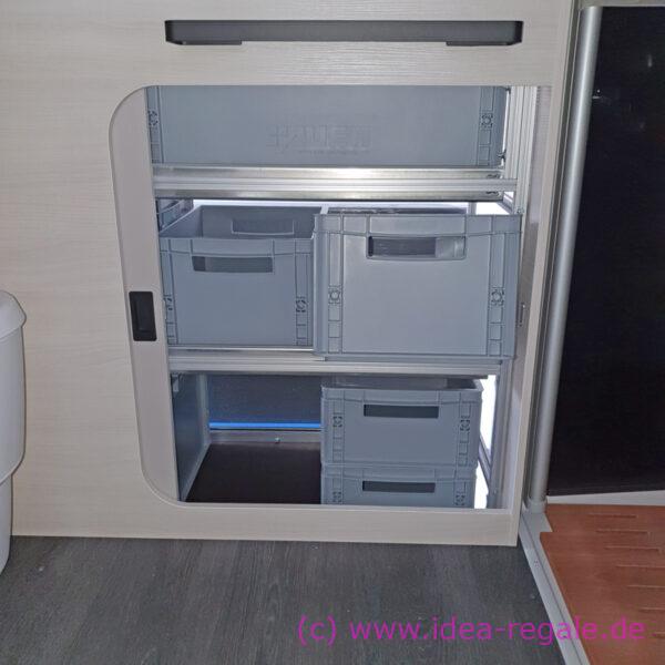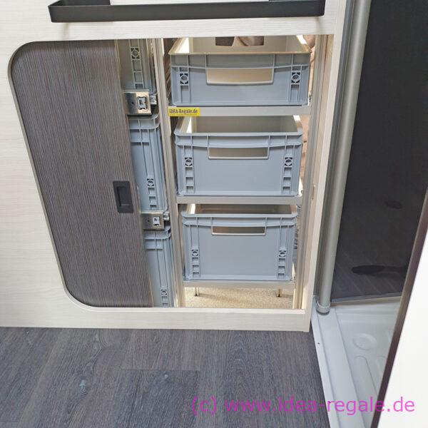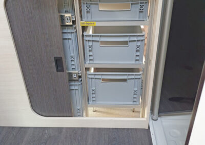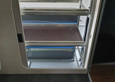 Chausson 260 Trio-Auszug mit Bretteinlage – 120 cm lange Teleskopschiene – die Boxen können per Hand auch mal in den Innenraum entnommen werden