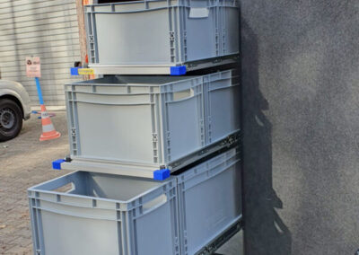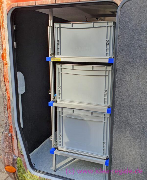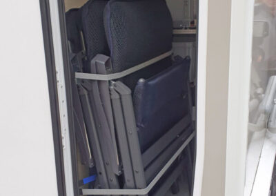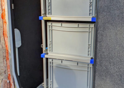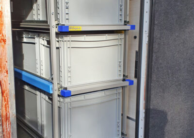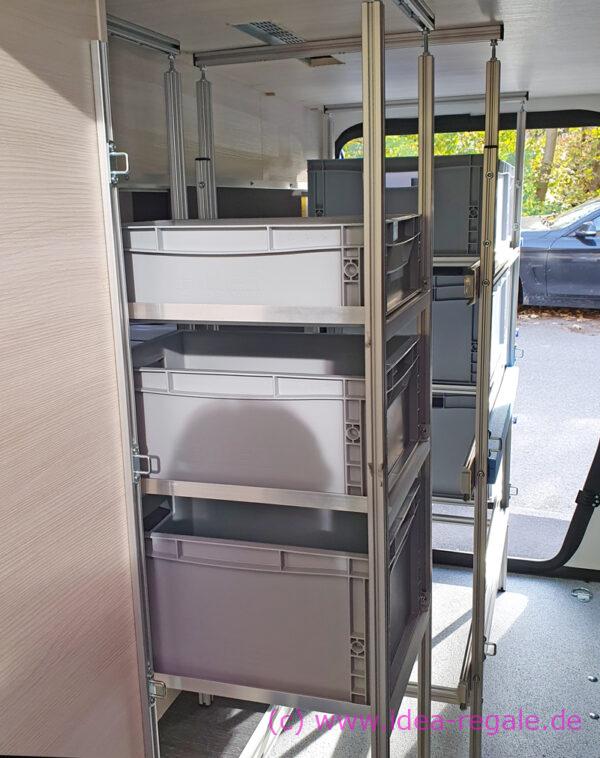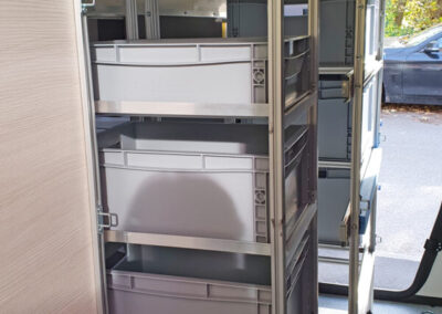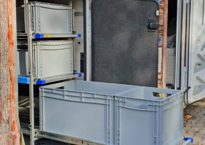 die Boxen in den Innenraum werden per Hand ohne Teleskopschienen entnommen, spart Gewicht und Kosten