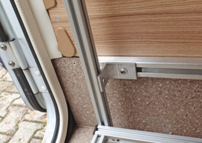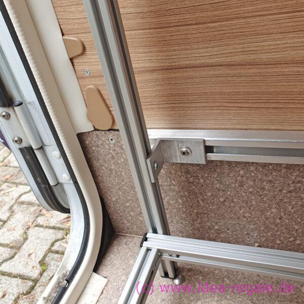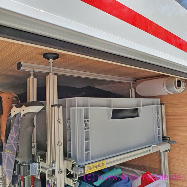 IDEA-Boxenregal in einem Dethleffs ALPA Auf der linken Seite steht ein Boxentower und gegenüber wurde noch vor dem Sockel eine Camping-Stellage light angebaut. Die Boxen werden zu Türe hin heraus gezogen, so das die Räder im Pedi-Packer Fahrradträger stehen bleiben können. Die lange Camping-Stellage light wurde noch mit Winkeln an der Zurrleiste verankert um ein verrutschen bei einer Vollbremsung zu verhindern. Die Fotos wurden uns vom Kunden O.Körner zur Verfügung gestellt. Vielen Dank
