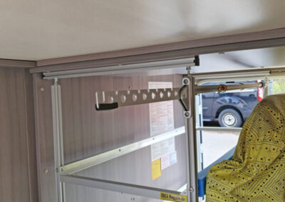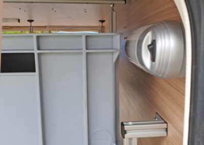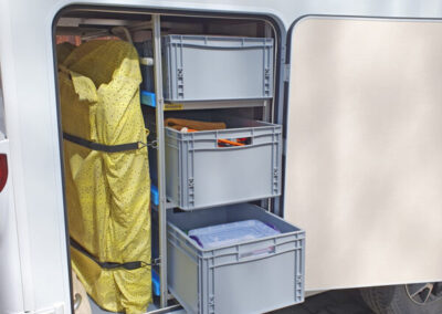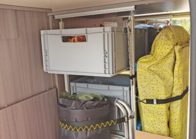 Dethleffs T6 Globebus – Regal mit seitlicher Entnahme der Boxen zur Türe hin – keine Teleskopschienen um Gewicht zu sparen