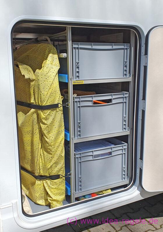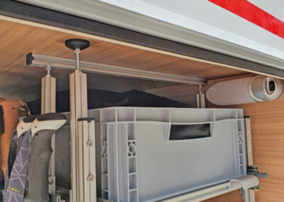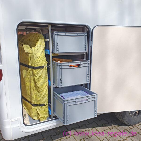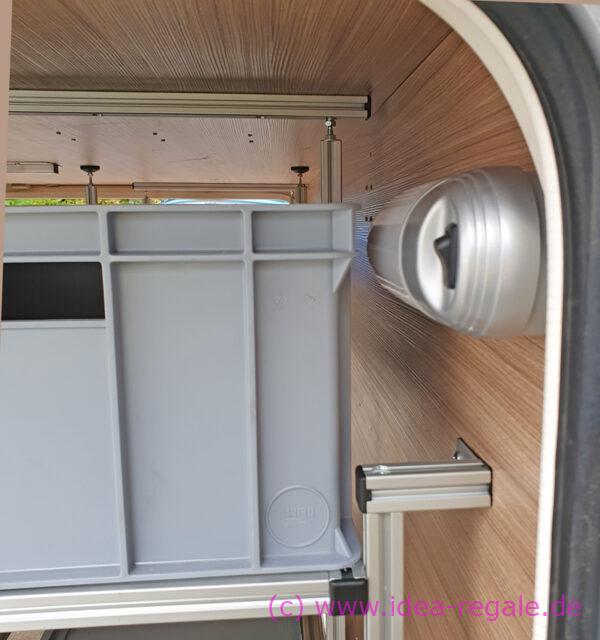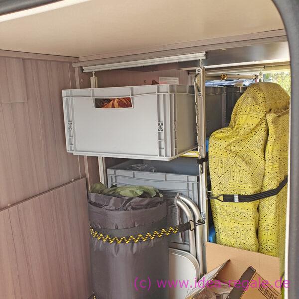 Dethleffs T6 Globebus - Regal mit seitlicher Entnahme der Boxen zur Türe hin - keene Teleskopschienen um Gewicht zu sparen