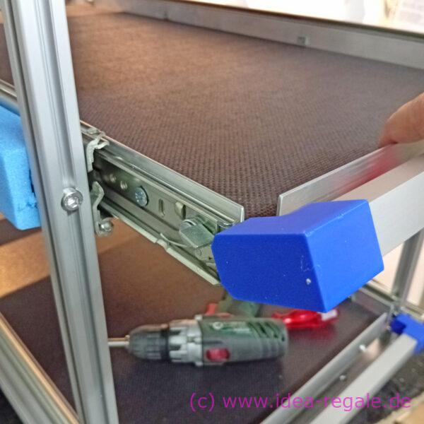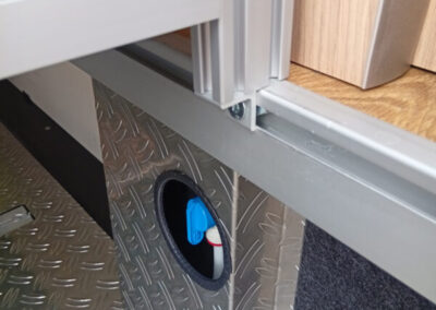 Beim Auszug auf der Fahrerseite ist die Abstützung vom oben durch die Luke zu sehen und liegt nicht ganz flächig als Befestigung an. Man benötige zwei weitere Profile 12 cm mit der gleichen Bohrung wie die andere Stütze und zwei längere Schrauben, um diese zu verbinden.