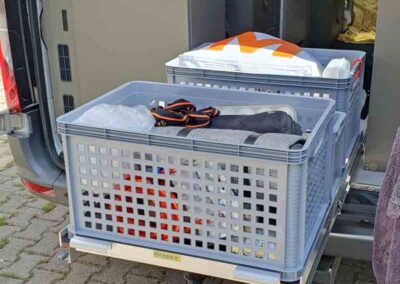 Beim Auszug den wir an der Zurrschiene montiert haben, wurde die Siebdruckplatte nach oben montiert, um mehr Breite für die Box zu haben. Daher kann man darunter noch Gegenstände einschieben oder in einem Fixierungsrahmen auch flache Boxen einschieben. Die hintere Box bekommt man mit einer Schnur wieder nach Vorne. Da der Kunde unten noch flache Dinge einschieben wollte, wurde die Einhandentriegelung weggelassen.