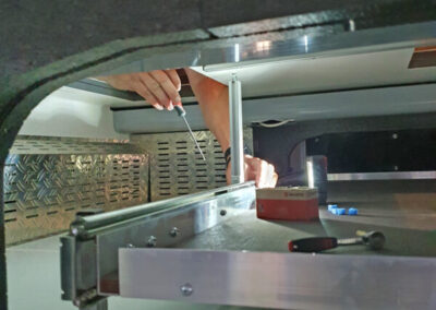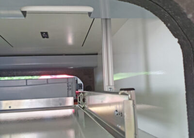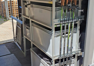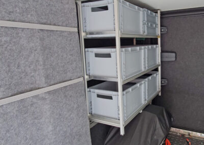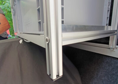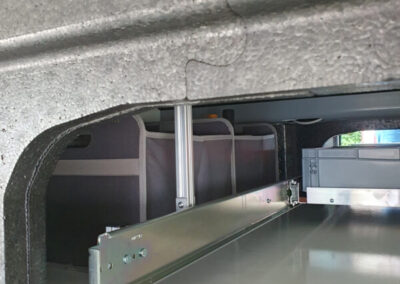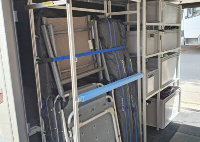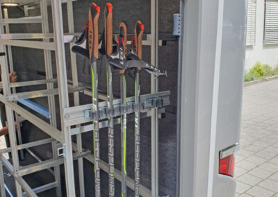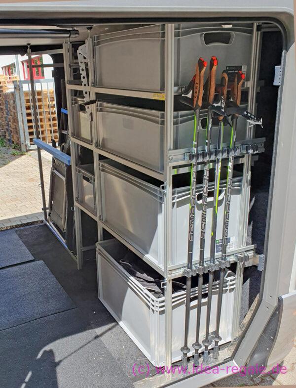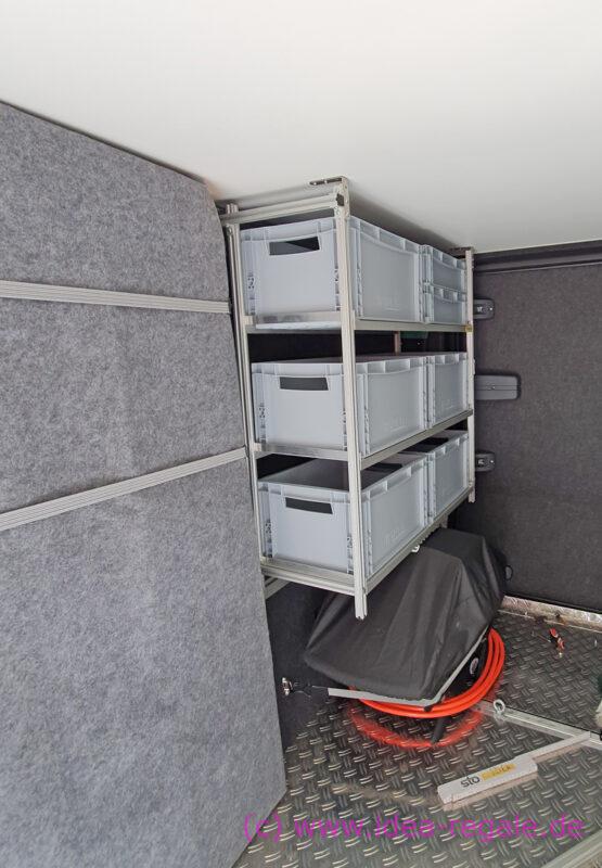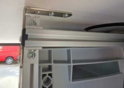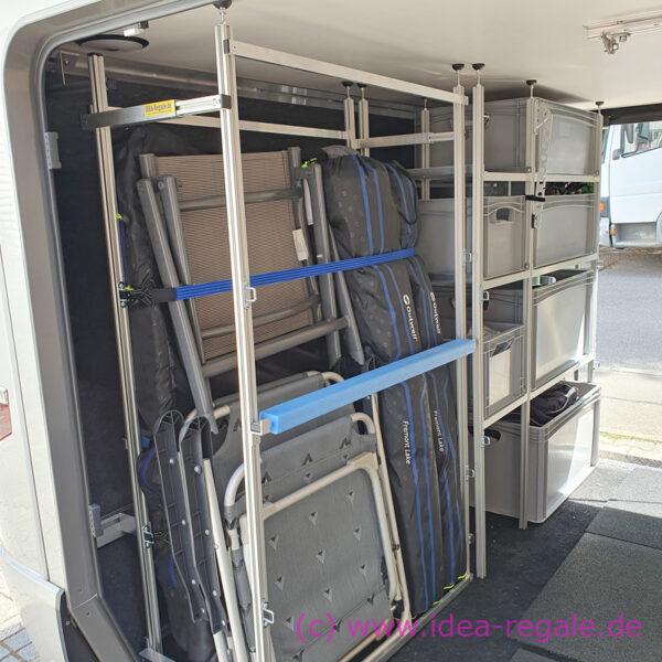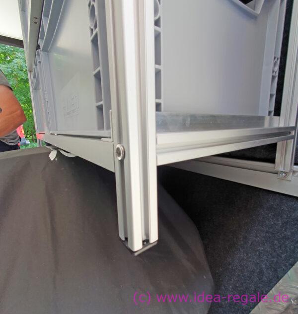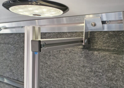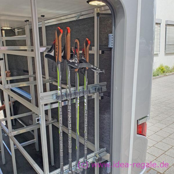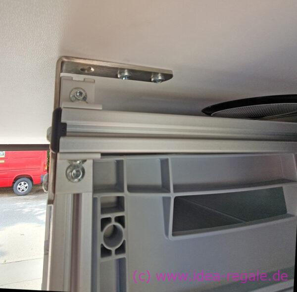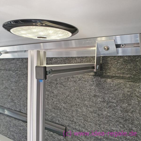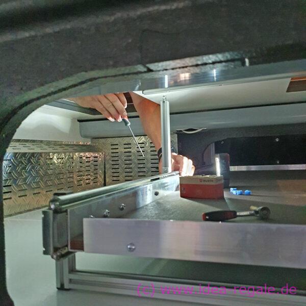 Hymer B 880 Regal Stütze auf Zurrschiene und mit Lufthaken und Winkel unter der Decke befestigt