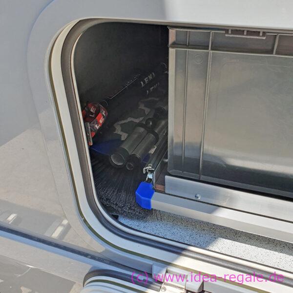 Regal mit Hundewagenplatz in einem Morelo. Daneben unser Pedi-Packer Fahrradträger.