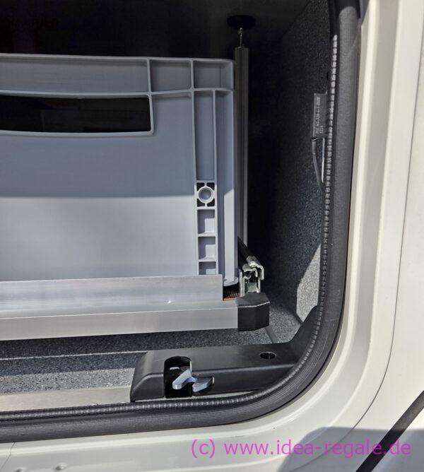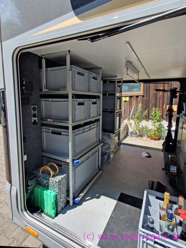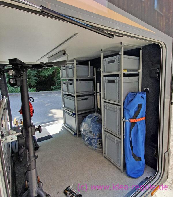 Morelo - Ausstellungsfahrzeug Der IDEA-Cargo-Tower im Ausstellungsfahrzeug ist wie folgt bestückt. 1 Regal mit Platz für 10 Boxen* und im hinteren Bereich ein Camping-Tower-Anbau (*Seifert-Boxen, transparent mit Deckel)