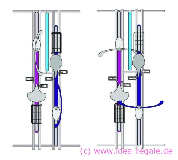 Die Räder werden gegen einander an den Mittelträger gelehnt und mit Spannriemen gesichert. Hier können die Räder auch gegenläufig eingestellt werden.
