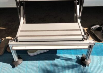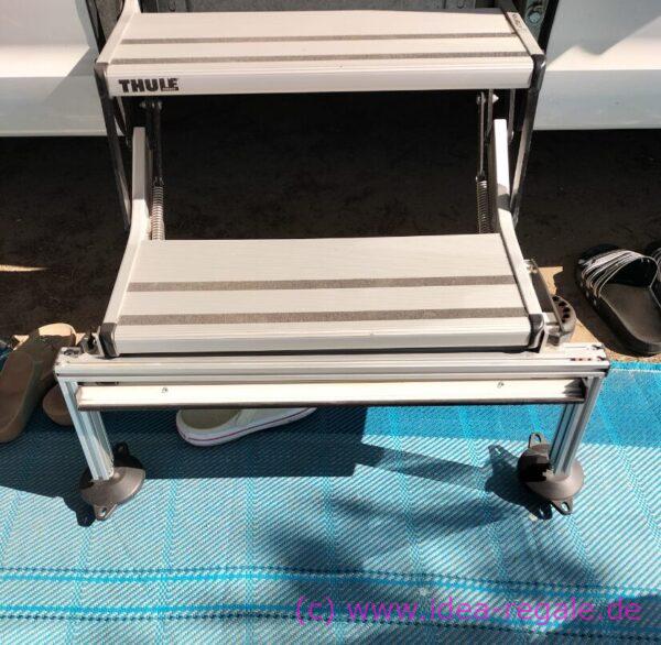 die Höhe kann mit dem großen 60er Justierfuss ausgeglichen werden. Wird am Campingplatz einfach darunter gestellt und seitlich fixiert. Sonderanfertigung auf Kundenwunsch nach Maßangaben vom Kunden