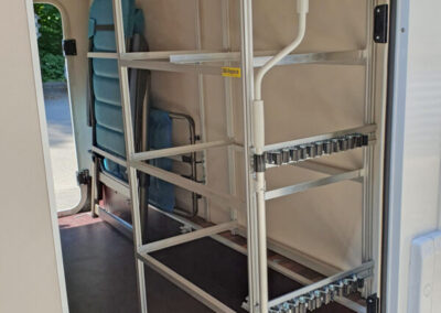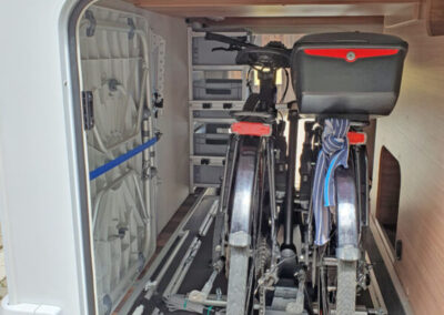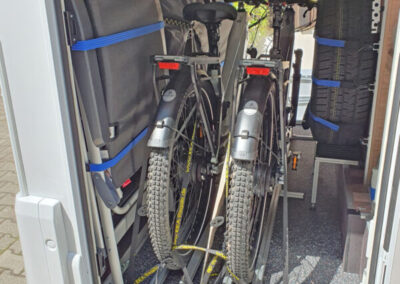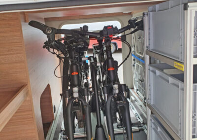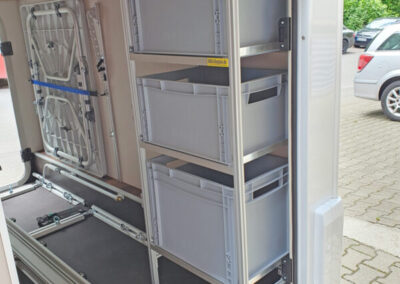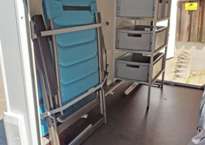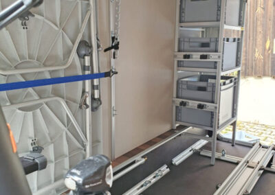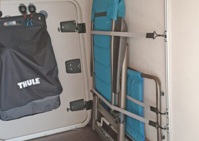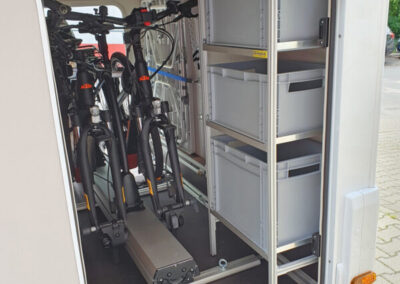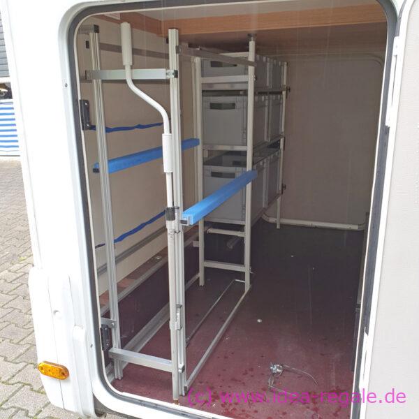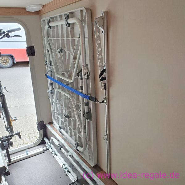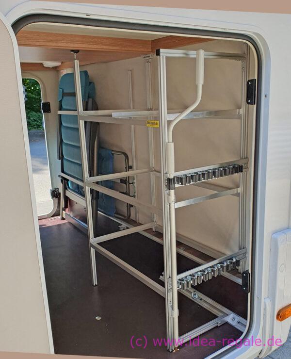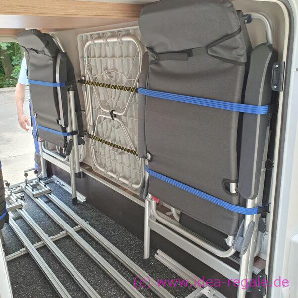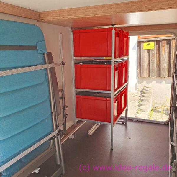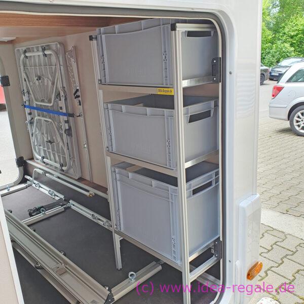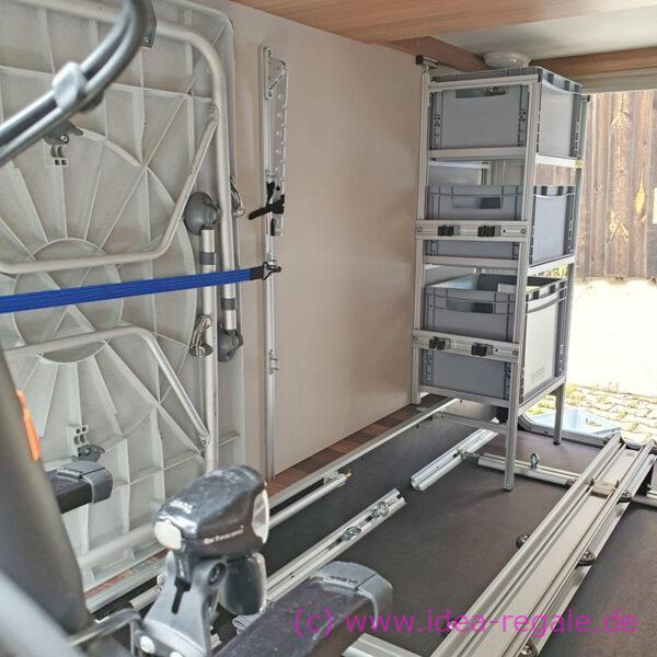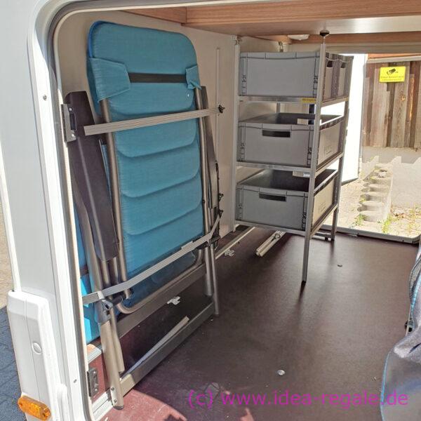 Hier wurde ein VCT-80 Vario-Camping-Tower für Tisch und Stühle eingebaut und dahinter ein Boxenregal. Fahrräder kommen nicht in die Pepper Heckgarage