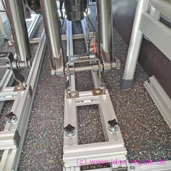 Der Bodenträger kann auf die ganze Breite verlängert werden und somit wird der Pedi-Packer eingeklemmt und muß nicht zusätzlich befestigt werden. Alternative geht es auch mit einer Schiebeverlängerung um den Pedi einspannen zu können.